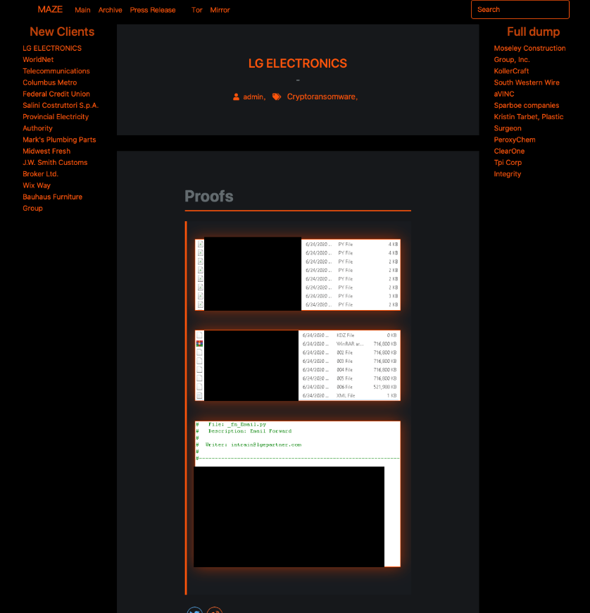 There is no information on how Maze was able to breach LG Electronics’ network but initial access methods used by the actor include connecting via an exposed remote desktop connection and pivoting to valuable hosts via compromised Domain Administrator accounts. But yet there is no official statement from the LG. Here are some proofs for their data and source code. The python code is said to be of a mailing project. Read more!