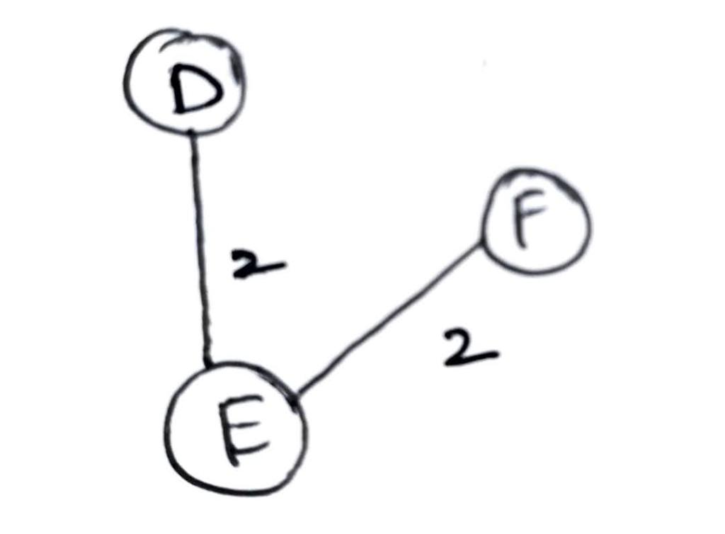 Step 3: From the root node E, select the path to which the edge weight is minimum out of the remaining connected nodes to the root. Here minimum weight is 2 compared to E->C which is 3. We are free to choose E->F or E->D. We choose here E->F.