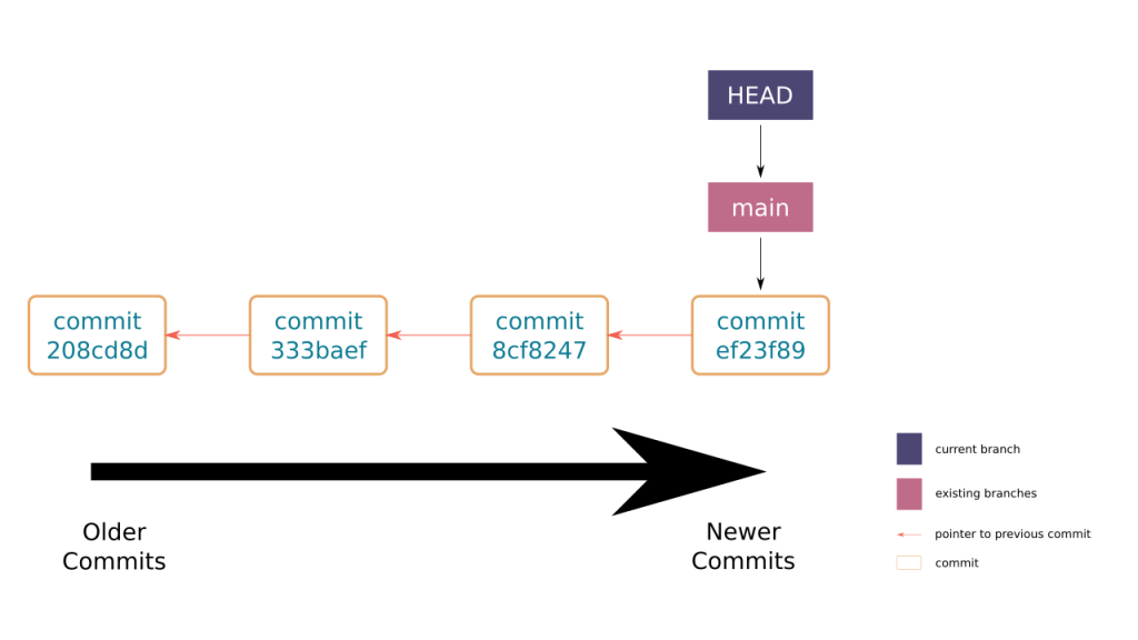 But how does Git keep track of various branches? For this, it uses a special pointer named HEAD. For most people, HEAD points to the default branch, usually named main or master. If you only have a single branch in Git, then the branch pointer keeps pointing to the latest commit.