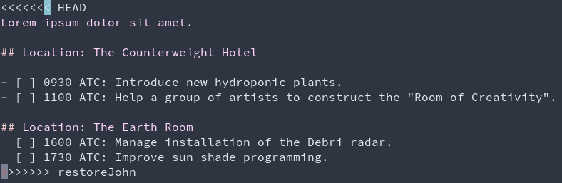 Large teams often use multiple branches to increase their throughput. A common issue with having a large number of branches is merge conflicts. These occur when two or more branches modify the same file in contradicting ways. When such branches need to be merged into the main branch, Git asks the person doing the merge about the version of the file to keep. To help resolve such conflicts, Git marks the conflicting regions in the files in a special way. An example is given below.